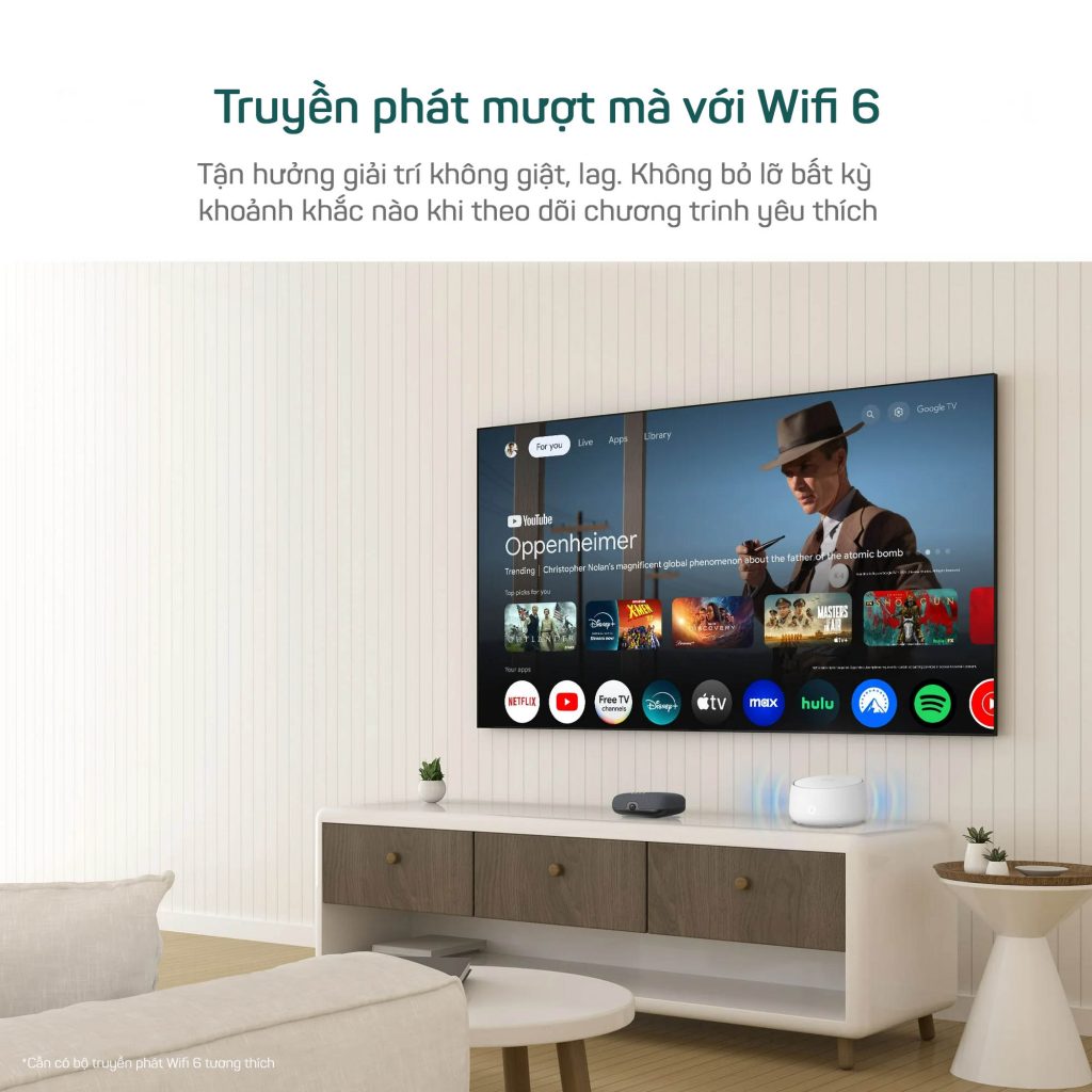 Hỗ trợ Wi-Fi băng tần kép, Bluetooth 5.0, cổng HDMI 2.1, Google TV Box 4K Pro cho tốc độ truyền tải nhanh, ổn định. Thiết kế nhỏ gọn, tinh tế, dễ dàng bố trí trong mọi không gian phòng khách.