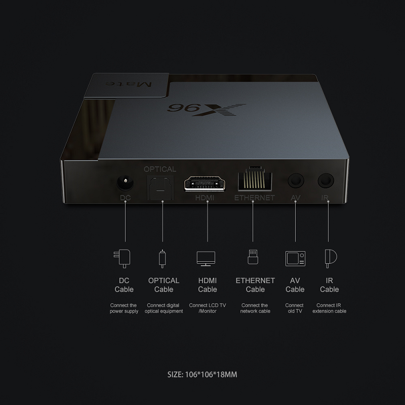 Android tiv box X96 mate còn được tích hợp đầy đủ các cổng giao tiếp như 02 cổng USB, 01 cổng âm thanh số Optical, 01 cổng AV sử dụng cho tivi đời cũ và cổng IR truyền thống của dòng X96 series (cổng nối dài mắt hồng ngoại - lưu ý Box không kèm cáp nối dài mắt hồng ngoại, nếu khách có nhu cầu phải mua rời)
