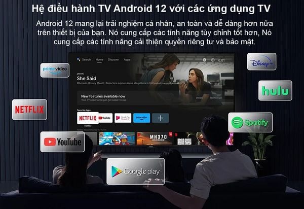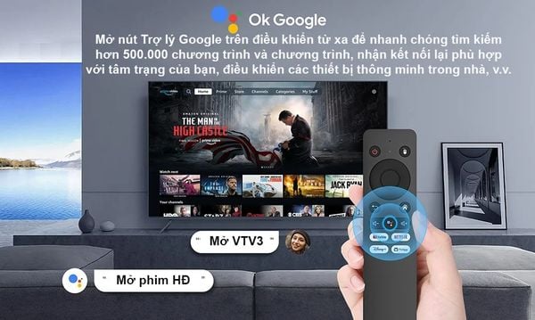 Đi kèm bộ sản phẩm là remote hỗ trợ tìm kiếm giọng nói bằng tiếng Việt. Thay vì phải gõ phím mệt mỏi, bạn chỉ cần giữ nút và nói: "Mở Youtube", "Thời tiết hôm nay thế nào?" hoặc "Kết quả bóng đá", thiết bị sẽ thực hiện ngay lập tức.